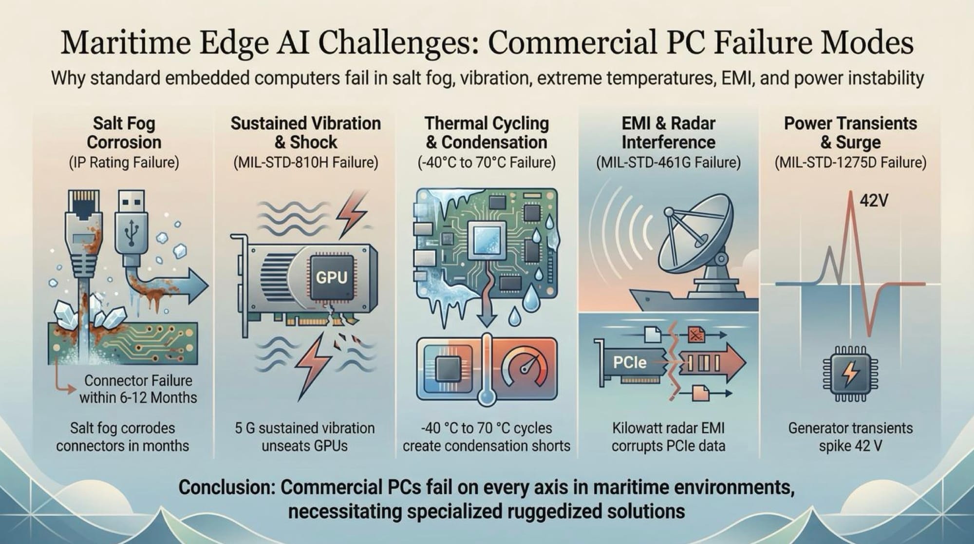 Deploying edge AI on maritime vessels presents extreme reliability challenges that eliminate commercial embedded computers. The table below maps operational conditions to failure modes: