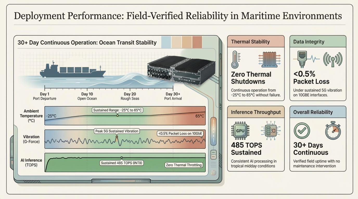 Field testing verified 30+ day continuous operation with zero thermal shutdowns across -25°C to 65°C ambient conditions. The platform maintains <0.5% packet loss on 10GbE sensor interfaces despite sustained 5G vibration, enabling 60 FPS multi-camera object detection with 485 TOPS sustained inference throughput.