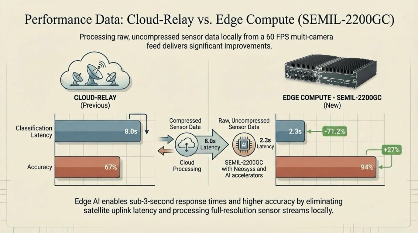 The accuracy improvement stems from processing raw, uncompressed sensor data locally rather than relying on compressed streams transmitted over bandwidth-constrained satellite links. Latency reduction from 8.0s to 2.3s proves critical for collision avoidance scenarios where vessel closing speeds demand sub-3-second response times.