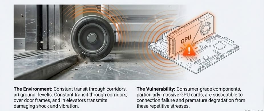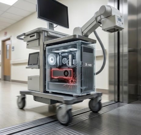 Mobile X-ray units navigate through hospitals constantly, encountering elevator thresholds, door frames, and hallway obstacles that transmit shock and vibration to onboard electronics. Consumer-grade computing components lack resilience against these repetitive mechanical stresses, leading to connection failures, component loosening, and premature system degradation. GPU cards present particular vulnerability due to their mass and mounting configurations within standard enclosures.