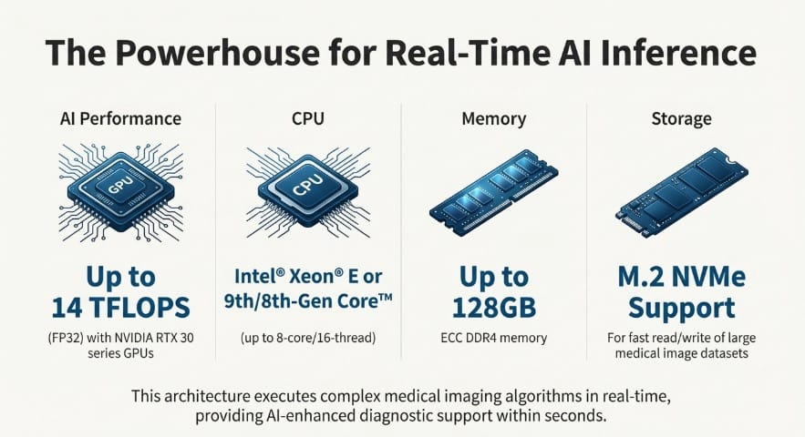 The platform combines Intel Xeon E or 9th/8th-Gen Core processors (up to 8-core/16-thread configurations) with workstation-grade Intel C246 chipset supporting up to 128GB ECC DDR4 memory. This foundation enables robust preprocessing and data management while the dedicated PCIe x16 slot accommodates NVIDIA RTX 30 series graphics cards delivering up to 14 TFLOPS of FP32 performance for AI inference. Medical imaging algorithms analyzing X-ray captures execute in real-time, providing radiologists with AI-enhanced diagnostic support within seconds of image acquisition.