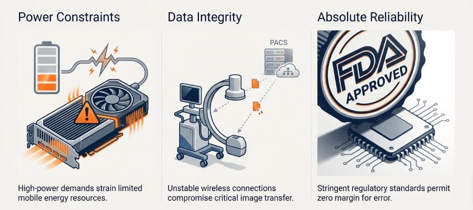 Medical device manufacturers developing AI-powered mobile X-ray systems confront multiple technical obstacles that compound in portable environments.