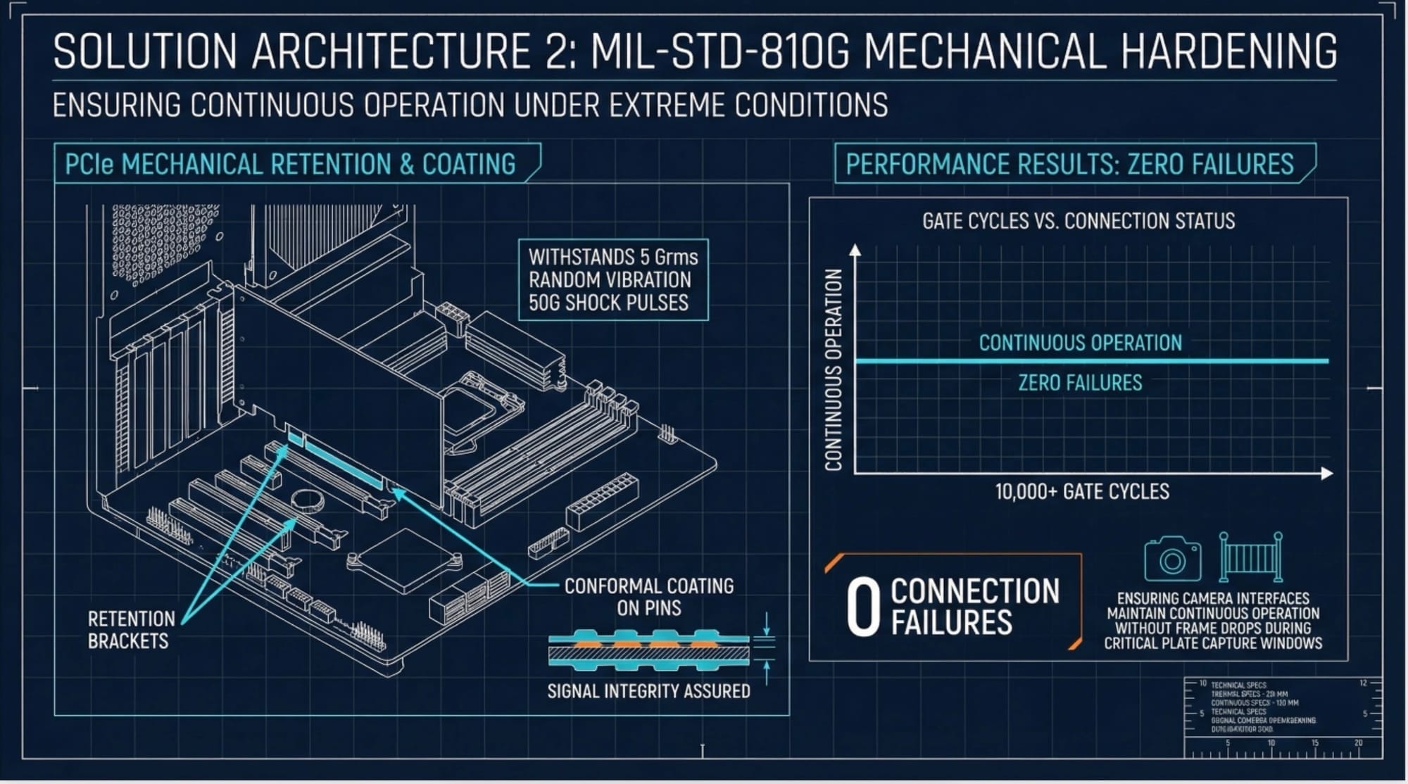 - Mechanism: PCIe slots incorporate mechanical retention brackets and conformal coating on connector pins. Entire assembly withstands 5 Grms random vibration and 50G shock pulses.