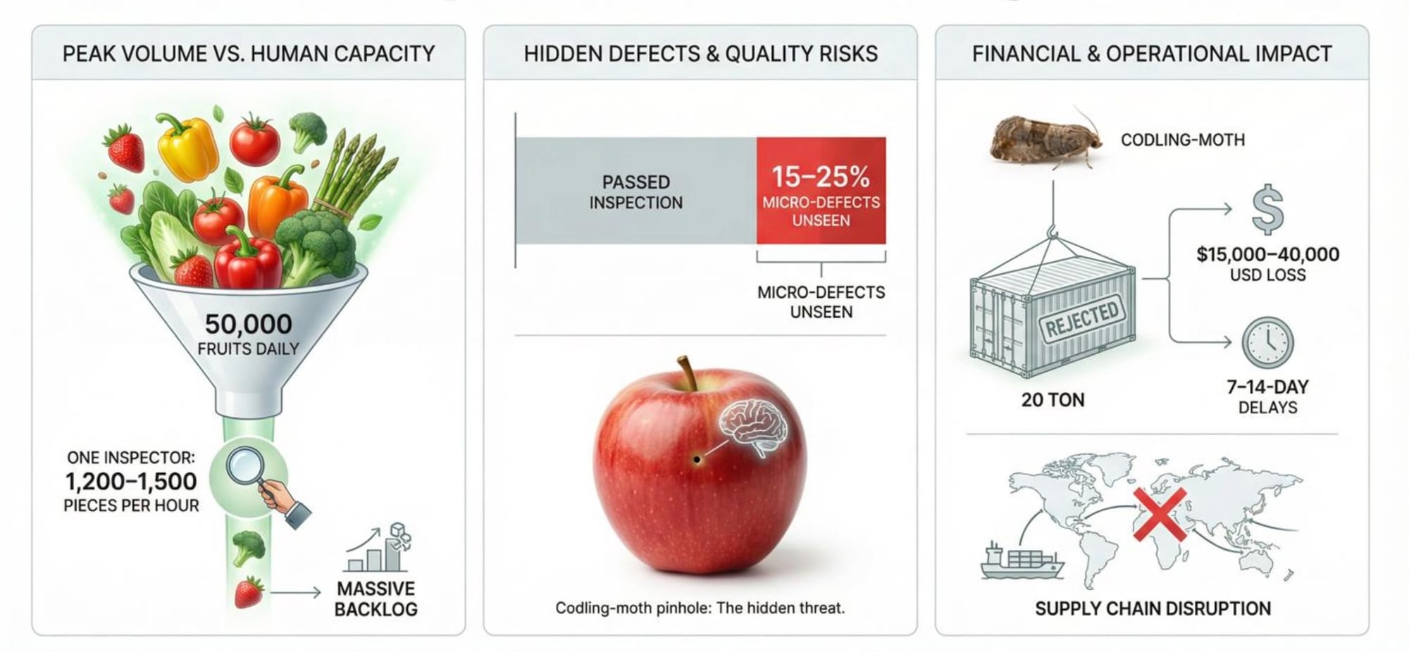 Agricultural exporters face a critical dilemma: quarantine pests and microscopic fruit damage that escape detection during manual inspection can trigger complete shipment rejections at destination ports. A single codling moth-damaged apple in a 20-ton container can result in fumigation requirements, shipment delays of 7-14 days, or outright rejection—costing exporters between $15,000 and $40,000 per incident.