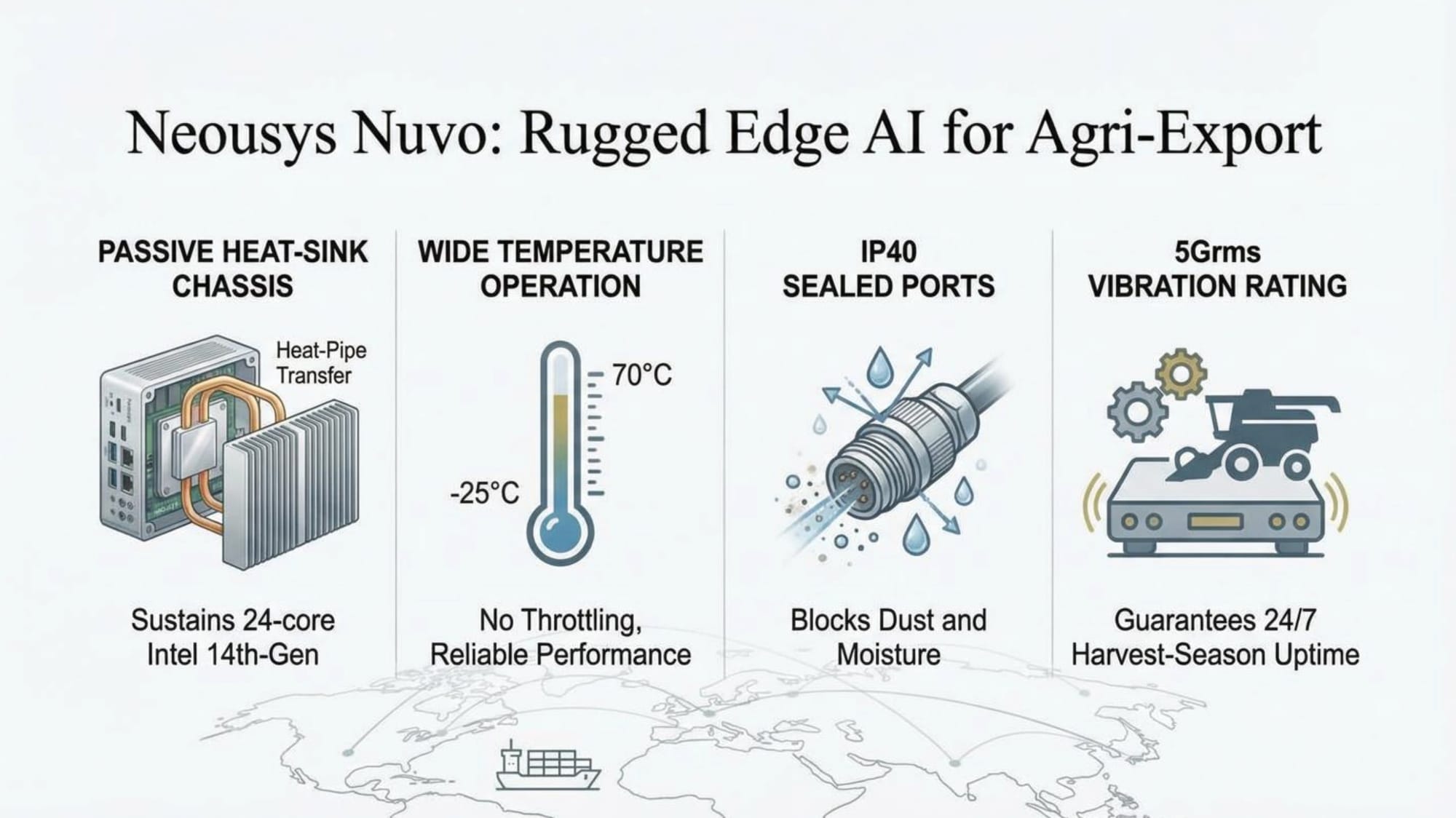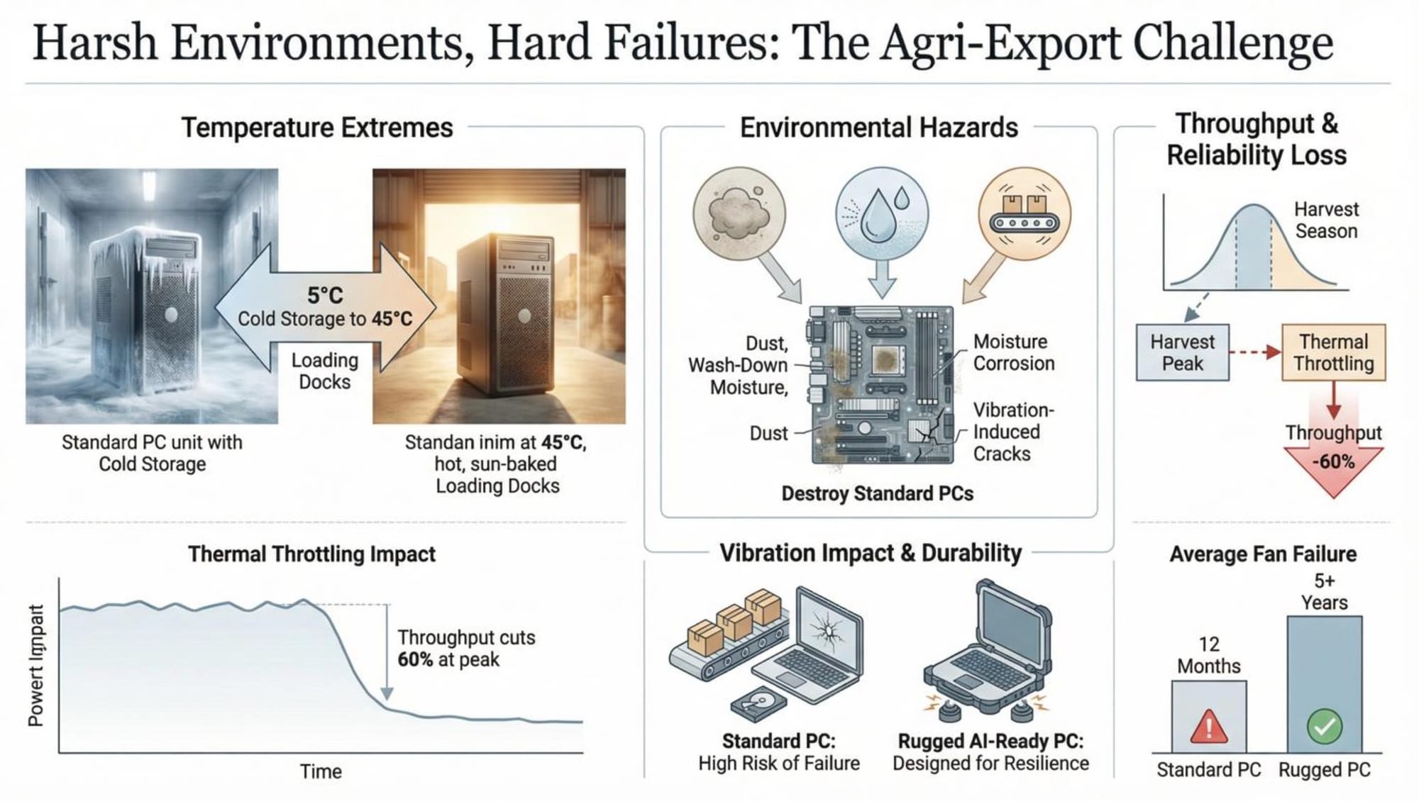 Agricultural packing facilities present one of the harshest operating environments for computing equipment. Temperature fluctuations between 5°C during cold storage operations and 45°C in outdoor loading areas create severe thermal stress on conventional computing hardware. The automation solution provider initially deployed standard industrial PCs but encountered critical performance throttling when ambient temperatures exceeded 35°C during summer harvest periods.