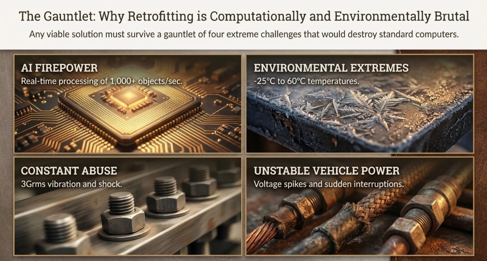 Previous computing solutions forced unacceptable compromises. Industrial-grade systems often lacked sufficient GPU performance for AI workloads. Consumer GPU workstations couldn't survive the environmental extremes. The retrofit solution demanded a platform that eliminated these trade-offs entirely.