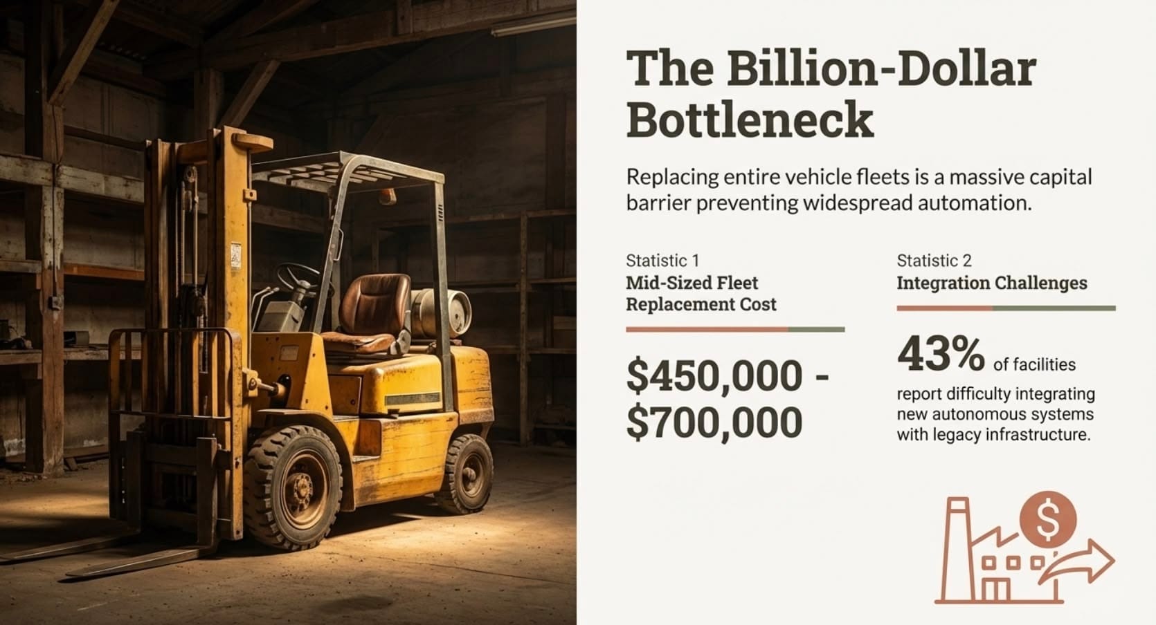 However, the high cost of replacing entire vehicle fleets with purpose-built autonomous systems remains a significant barrier. Mid-sized AMR fleet installations (20-25 units) typically cost between $450,000 and $700,000, while large fleet replacements can exceed seven figures. Additionally, approximately 43% of manufacturing facilities report difficulty integrating new autonomous systems with legacy infrastructure. These challenges have created strong demand for retrofit solutions that can transform existing industrial vehicles into autonomous fleets without massive capital expenditure.